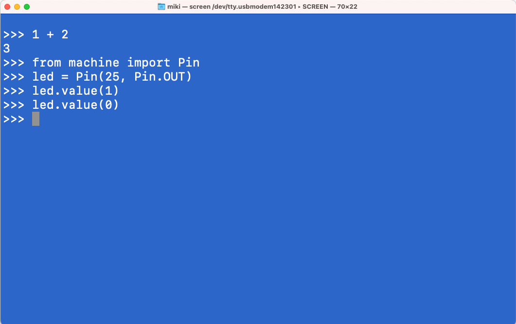 screen /dev/tty.usbmodem142301We are now connected to Python REPL (Read Eval Print Loop).
